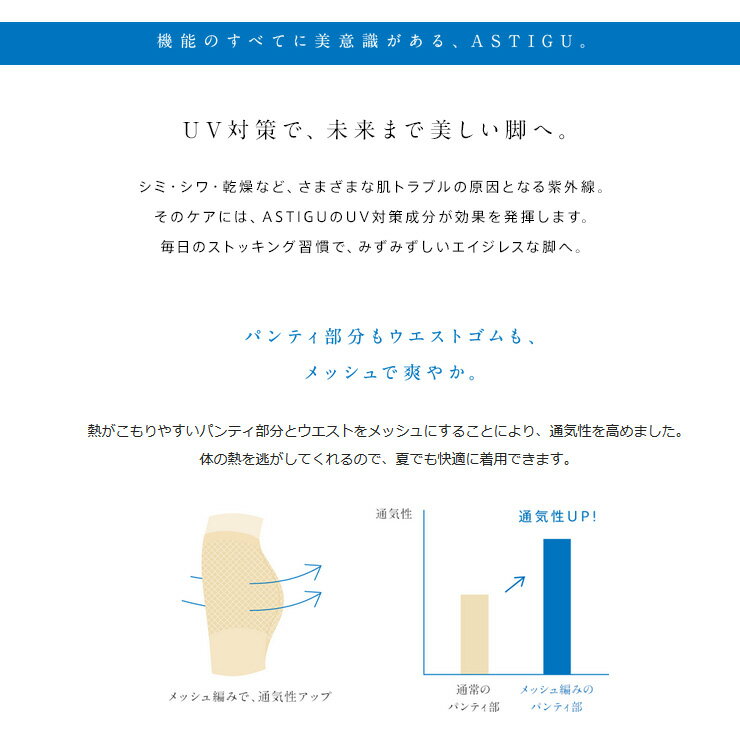 サイズ S〜M(ヒップ:80-93cm、身長:145-160cm) M〜L(ヒップ:85-98cm、身長:150-160cm) L〜LL(ヒップ:90-103cm、身長:155-170cm) 特徴 〜ASTIGU(アスティーグ)〜 「はかなきゃいけない」から「はきたい」ストッキングへ。