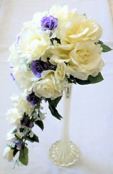 ウエディングブーケ/ブライダルブーケ/白バラ&かすみ草 キャスケードブーケ (ブルー・パープルのミニバラ付き)・ブートニア付き【bouqet】