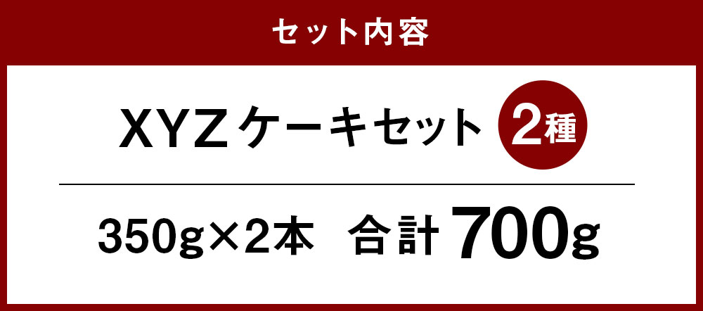 商品詳細 名称 XYZケーキセット(2種) 製造地 熊本県 内容量 合計700g(350g×2本) 原材料名 【ガトーショコラ】 チョコレート・ジャージー牛乳バター・ジャージー牛乳生クリーム・グラニュー糖・卵 【チーズケーキ】 クリームチーズ・ホワイトチョコレート・ジャージー牛乳ヨーグルト・ジャージー牛乳生クリーム・レモン果汁・コーンスターチ・ゼラチン 賞味期限 別途商品ラベルに記入 保存方法 -18℃以下にて保存 提供者 株式会社じぞう屋 ・ふるさと納税よくある質問はこちら・寄付申込みのキャンセル、返礼品の変更・返品はできません。