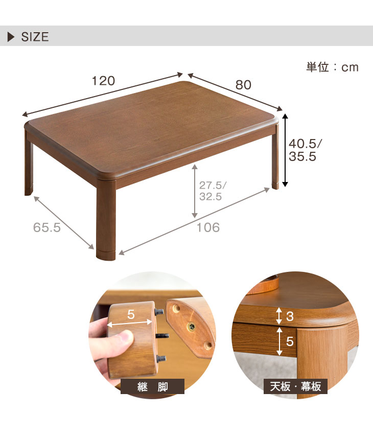 仕様サイズ幅120×奥行き80×高さ35.5cm(+5)【スタッフさおりんのおすすめポイント!】 ・オールシーズン使える家具調こたつ! ・用途に応じて選べる高さ5cmの継ぎ脚付き ・安心、安全のラウンド加工・ヒーターは安心のメーカー1年保証 ・天板は傷や熱にも強いUV塗装重量約18kg素材天板: MDFダイレクト印刷(ハニカム構造) ※UV塗装 幕板:ラバーウッド ※ウレタン塗装仕上げ 脚:ラバーウッド ※ウレタン塗装仕上げヒーターメトロ電気工業製 石英管ヒーター(510W) 品番:MSU-501H 電源:交流100V 50-60Hz ヒーター:U字形石英管ヒーターコード長さ:3m 1時間あたりの標準消費電力 ■強:約170Wh/■弱:約80Wh 1時間あたりの電気代 ■強:約4.6円/■弱:約2.2円 (※新電力料金目安単価 1kWh あたり 27 円(税込)で計算しています。