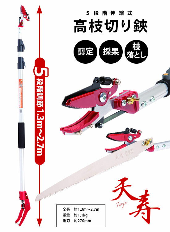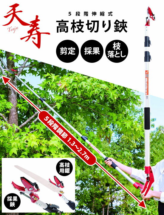 天寿 伸縮式高枝切 1本で高枝切鋏・高枝鋸・採果鋏の3役 天寿 伸縮式高枝切 ●1本3役の高枝切りはさみ ●5段階伸縮可能な高枝切り鋏 ●鋸刃をつけて高枝切鋸にも使える高枝切はさみ ●採果に使える採果バサミにも ●生木の直径15mmまでカットOK 天寿鋸でお馴染みの天寿刃物本舗より発売された伸縮式高枝切りばさみです。