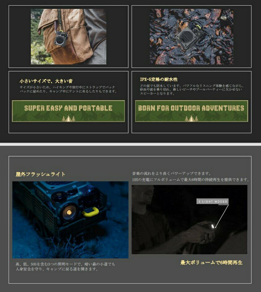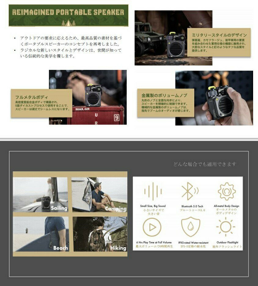 メタルグレー ジャングルグリーン 砂漠イエロー●サイズ:高さ:77.9mm×長さ:60.8mm×幅:35.7mm●重量:248g●Bluetooth:Blutoothバージョン5,コーデック:AAC,SBC●スピーカー:4Ω5W●アンプ:5W●SNR:>70db●SFR:80Hz-18,000Khz●バッテリー:3.7V/800mAh●充電ポート:Micro USB●充電電圧:DC 5V 1A●充電時間:約2時間で満充電●再生時間:満充電から音量100%で約6時間、音量50%で約10時間、音量30%で約12時間■広告文責株式会社マツムラカメラ 076-242-1122区分:電化製品メーカー:MUZEN AUDIO INC※使用感には個人差がございます。